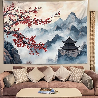estetica orientale arte murale arazzo tradizionale cinese inchiostro paesaggio rosso fiore di prugna pagoda montagna nebbia sereno zen arredamento per meditazione studio yoga