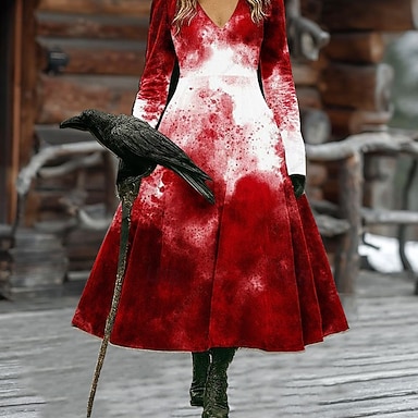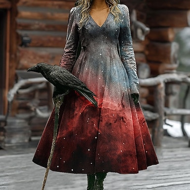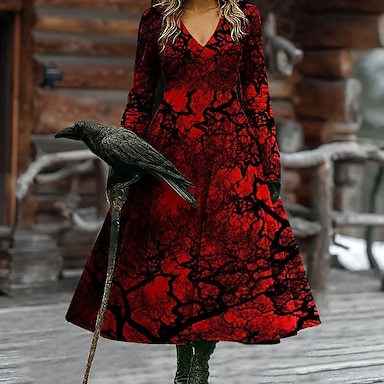 Abito Midi da Donna Stampa Strega Abito A-Line Vacanze Casual Quotidiano Regolare Vestibilità Grafica Floreale Hocus Pocus Maniche Lunghe Collo a V Nero Rosso Marrone Primavera Autunno