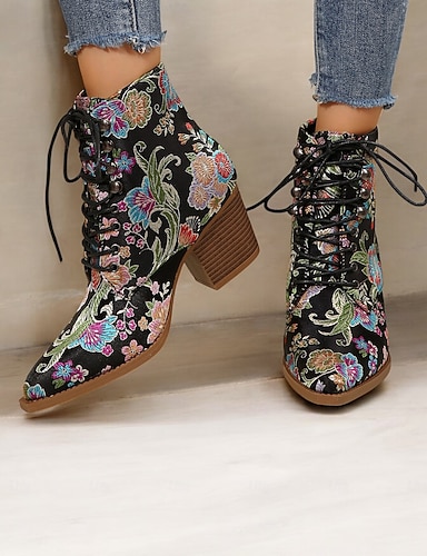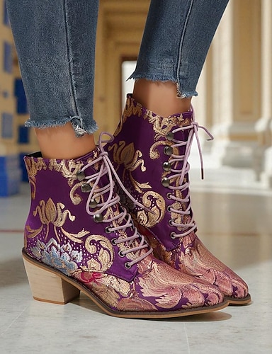 stivaletti da donna in jacquard viola con lacci, ricami floreali e tacco basso a blocco - stivali in stile barocco vintage per donne, perfetti per festival e feste Gatsby