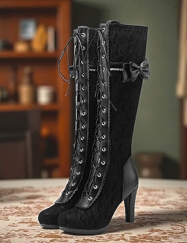 stivali da donna con lacci sopra il ginocchio in stile gotico – tacchi lolita in velluto nero con fiocchi di raso per Halloween, cosplay e feste di ispirazione vintage