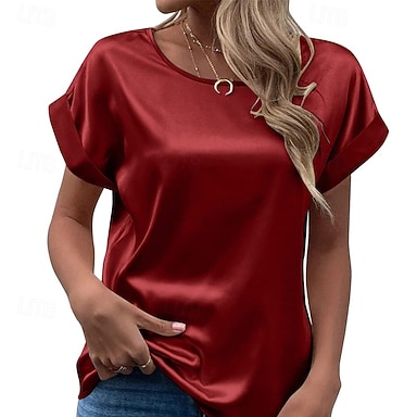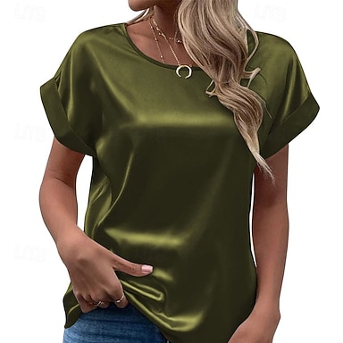 Per donna Elegant Top in raso Maglietta A calotta di seta Semplice Moda Moderno Manica Corta Girocollo Top Regolari Quotidiano Uscire Weekend Verde chiaro Verde scuro Viola Grigio chiaro Estate