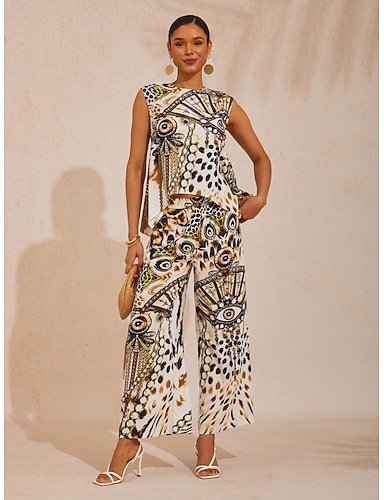 Blusa da donna retro maniche a rouches a strati grafica vintage geometrica alla moda quotidiana maniche 3/4 lunghezza regolari abbigliamento da vacanza estiva primavera vino cammello arancione