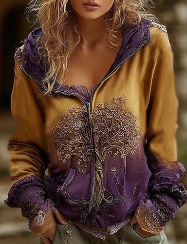 Per donna Felpe con cappuccio Patchwork Cerniera Tasca Floreale Grafico Moda Casual Manica Lunga Con Cappuccio Top Regolari Streetwear Abbigliamento Quotidiano Viola Primavera Autunno