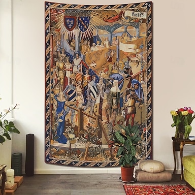 torneo reale medievale giostra festival fortis testo stendardo fleur de lis scudi cavalieri in armatura rinascimentale figure nobili arazzo da parete arazzo da parete per soggiorno camera da letto