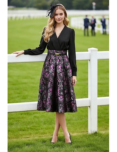 Abito a lunghezza tè A-Line Abito da festa Abito da cocktail Abito per matrimonio Abito per madre della sposa Maniche lunghe Collo a V Elegante Vintage Festa con fiori