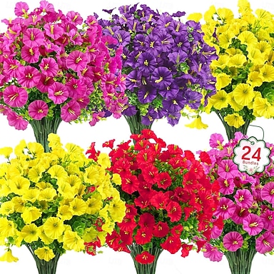 Confezione da 24 fiori artificiali per esterni, piante artificiali finte in plastica resistenti ai raggi UV, fioriere sospese per portico, finestra, casa, matrimoni, decorazioni autunnali ed estive (24, fucsia, viola, giallo, verde)