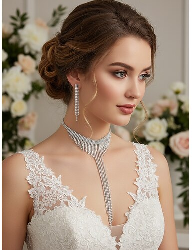 Set di gioielli da donna con strass scintillanti: collana girocollo in argento e orecchini lunghi con nappe, accessori glamour per balli serali e cocktail party