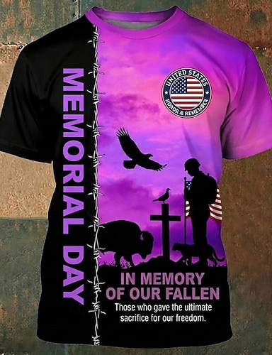Giorno della memoria "in memoria dei nostri caduti" maglietta da uomo patriottica con stampa integrale di soldati, girocollo, maniche corte, viola, tributo ai veterani, regalo di onore, abbigliamento
