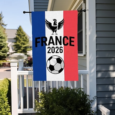 Bandiera da giardino per i Mondiali di calcio Francia 2026, con design tricolore, emblema del gallo e pallone da calcio, perfetta decorazione per esterni per i tifosi di calcio francesi.