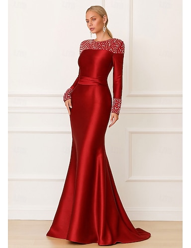 Sirena Tromba Lunghezza al pavimento Abiti da Ballo Abito da Sera Da principessa Abito formale Elegante Brillanti Manica Lunga Girocollo Matrimonio Formale Raso Elasticizzato con Perle