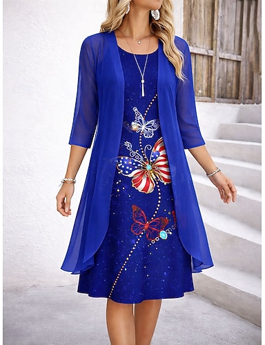 Giorno dell'Indipendenza Set Vestito Donne Patriottico Vestito A-Line Elegante Vacanza Grafica Bandiera Stampa Strati Vestito Midi Maniche Half Collo Rotondo Quotidiano Blu Estate Primavera Fit