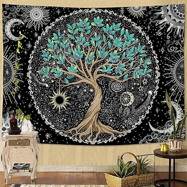 albero della vita mandala celeste arazzo da parete sole luna stelle galassia acchiappasogni bohémien hippy psichedelico nero verde acqua camera da letto soggiorno dormitorio arredamento meditazione