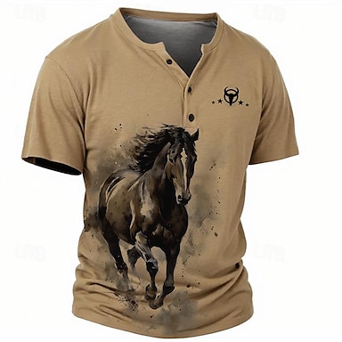 Per uomo Grafico Cavallo Fede Maglietta Maglia Henley Manica Corta Stampa 3D Classico Casual Sport all'Aperto Ferie Uscire Primavera & Estate Blu Cachi Grigio Henley Maglietta Henley