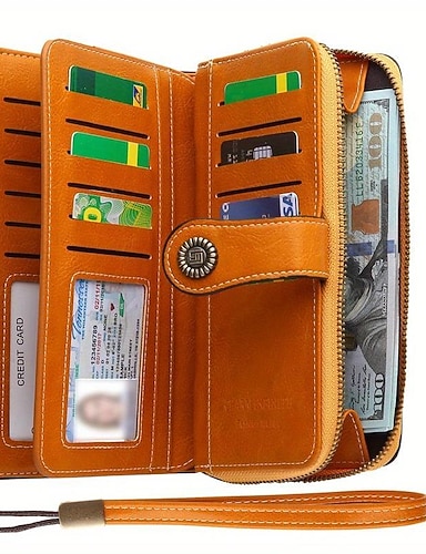 Portafoglio lungo con blocco RFID e polsino portafoglio in finto cuoio stile retrò con più scomparti per carte e finestra per ID
