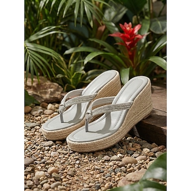 Eleganti sandali con zeppa da donna color grigio chiaro - cinturini infradito con strass scintillanti e plateau in espadrillas intrecciata, perfetti per resort all'aperto e feste in giardini