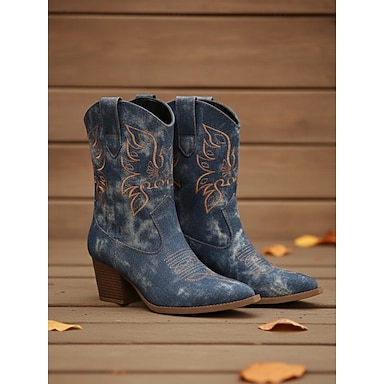 stivali da cowboy western ricamati in denim da donna - stivali a metà polpaccio in tessuto jeans blu vintage con tacco spesso per la moda urbana e gli outfit casual da streetwear