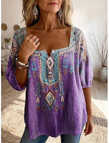 Per donna Blusa Stampato Floreale Grafico Paisley Quotidiano Elegante Essenziale Mezza Manica Collo quadrato Top Regolari Quotidiano Blu Viola Verde Estate Primavera