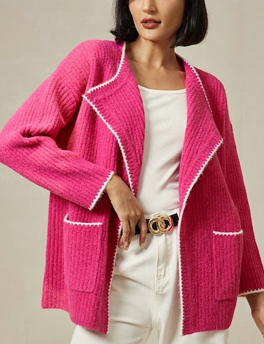 Per donna Cardigan Collo ripiegato A Coste Maglia Misto lana Blocco di colore Spalla scesa Autunno & Inverno Casual Quotidiano Casual Quotidiano Manica Lunga Colore a Contrasto Rosso rosa S M L