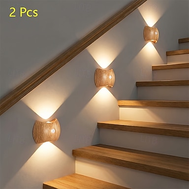 2 luci notturne ricaricabili con sensore di movimento intelligente effetto legno, clip magnetica, non necessitano di cablaggio, lampade a LED per uso interno – camera da letto, corridoio, scale,