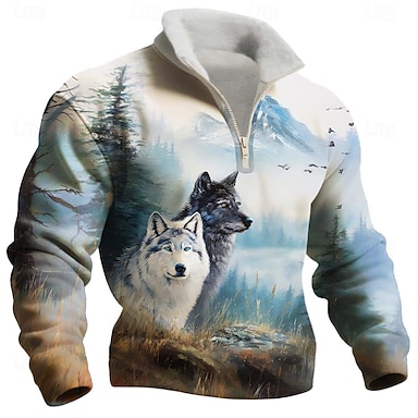 Per uomo Animale Lupo Pile Felpa Moda Casual 3D Collo alla coreana Zip a un quarto All'aperto Vacanza Regalo Abbigliamento casual alla moda Blu Blu 1 Blu 3# Blu 2# Mezza cerniera Autunno Inverno