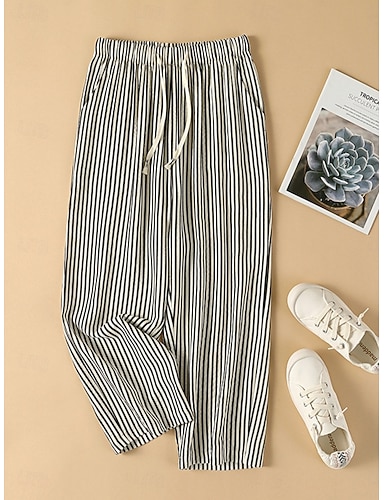 Per donna Finto cotone e lino Pantaloni Pantaloni casual Dritto Vacanza Moda Streetwear Lunghezza intera Vita Alta A righe Tasca Elastico in vita Comodità Confortevole Inelastico Quotidiano Vacanza