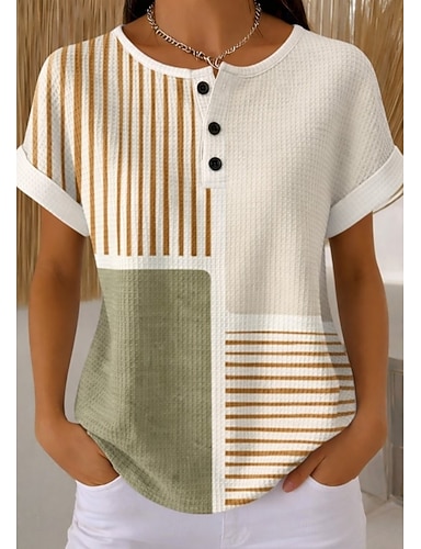 Top in maglia waffle per donna T-shirt a blocchi di colore bottone anteriore grafica geometrica piante elegante classica manica corta collo rotondo sportivi quotidiani fine settimana blu arcobaleno