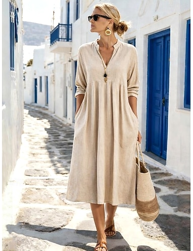 vestito midi da donna in cotone e lino, modello a trapezio, casual, quotidiano, vestibilità ampia, tinta unita, manica a 3/4, scollo a V, albicocca, estate e primavera
