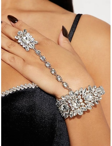 Bracciale da donna con catena in argento e strass, con anello importante, gioielli glamour per feste e occasioni speciali