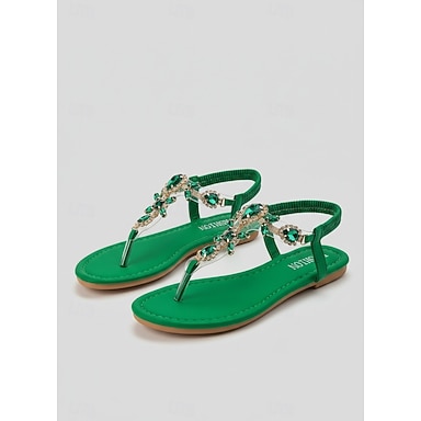 sandali da donna con cinturino a T decorato con strass verdi e cinturino elastico alla caviglia – eleganti calzature estive per la spiaggia, le feste o l'abbigliamento casual