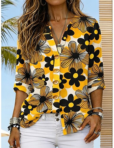 Per donna Camicia Tunica Top estivi Bottoni Floreale Grafico Vacanza Vintage Quotidiano Manica Lunga Scollo a V Top Regolari Quotidiano Ferie Uscire Blu Giallo Rosso Verde Estate Primavera