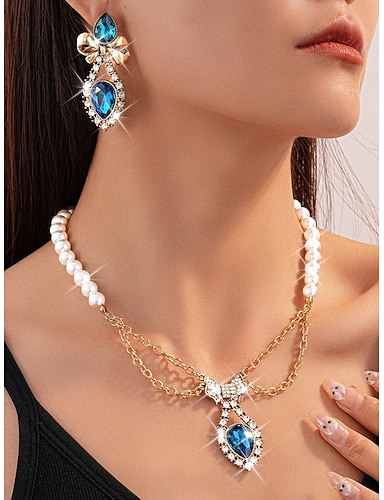 perla da donna &set di gioielli in cristallo blu: elegante collana e orecchini pendenti con dettaglio fiocco per feste, eventi serali &occasioni speciali