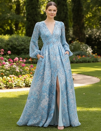 Linea ad A Lunghezza al pavimento Vestito maxi Abito da invitata a nozze Abito da cerimonia per signora Manica 3/4 Scollo a V Elegante Vintage Formale Raso Pizzo Organza con Stampa floreale Ricamo