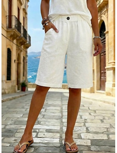 pantaloncini da donna in finto cotone e lino, bermuda, pantaloni capri, casual, corti, vita media, tinta unita, tasche laterali, traspiranti, comodi, anelastici, per uscire, weekend, neri, bianchi, gialli, verdi, estivi