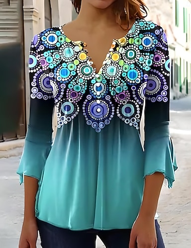 T-Shirt Donna Ombre Grafica Astratta Elegante Vintage Stile Manica 3/4 Collo a V Top Lunghi Giornalieri Uscita Bottoni Blu Rosso Arancione Verde Estate Primavera Autunno