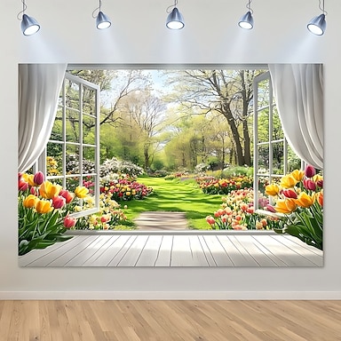 arazzo sospeso con stampa piatta 2D, design di un giardino primaverile, vista dalla finestra aperta di tulipani in fiore e sentiero, ideale decorazione murale per soggiorno e camera da letto