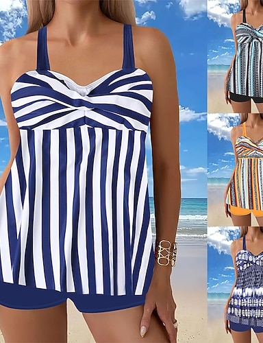 Costume da bagno Tankini da donna 2 pezzi con pantaloni corti controllo della pancia alta vita snellente senza schienale abbigliamento da spiaggia per le vacanze geometrico a righe scollo a V senza