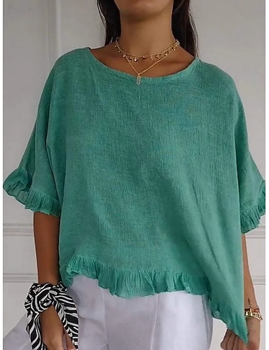 Per donna Camicie di cotone e lino Blusa Finto cotone e lino Volant Tinta unica Elegante Casual Mezza Manica Girocollo Top Regolari Quotidiano Blu Verde Albicocca Estate Primavera Autunno