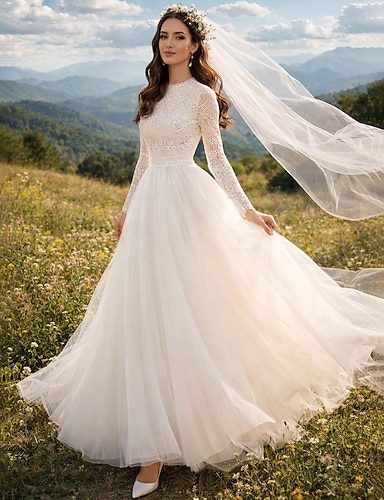 Abito da ballo Lunghezza alla caviglia Abiti da sposa Abito da sposa Vintage Anni 1940 / 1950 Piccoli Abiti Bianchi Manica Lunga Scollo Tondo Laurea Compleanno Raso Pizzo con Applicazioni Tinta unita