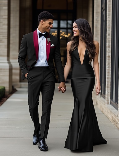 Abito da sera sirena tromba rosso e nero elegante abito formale da matrimonio lunghezza fino al pavimento smanicato collo a V crepe elastico con volant