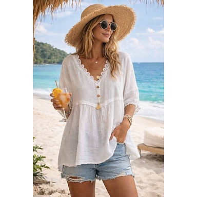 t-shirt da donna in cotone, maglietta, top, pizzo, bottoni, tinta unita, alla moda, elegante, classico, manica corta, scollo a V, top regolari, per tutti i giorni, per uscire, per il fine settimana,
