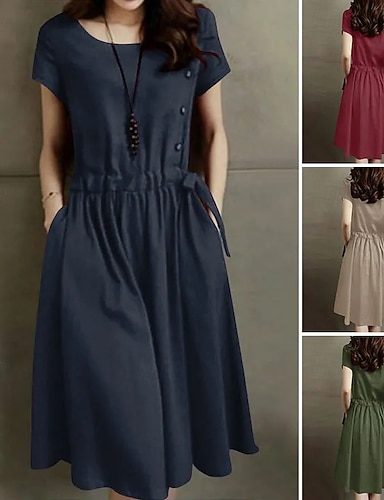 Per donna Mini Abito Finto cotone e lino Abito a trapezio Abito Estivo Casual Quotidiano Vestibilità regolare Semplice Manica Corta Girocollo Rosso Blu marino Verde militare Albicocca Estate Primavera