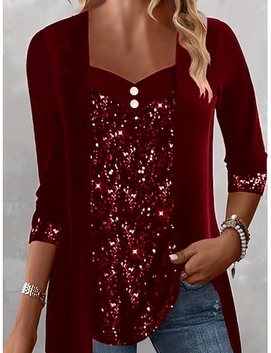 Camicetta di Colore Unito per Donne di Natale Stile Casual Maniche Lunghe Collo Quadrato Regolari Top Quotidiani Paillettes Patchwork Nera Vino Viola Verde Primavera Autunno Inverno