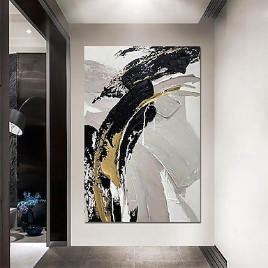 Dipinto a olio fatto a mano su tela, decorazione da parete, semplice, astratto, in bianco e nero, con applicazione di lamina d'oro per la decorazione della casa, dipinto appeso su telaio teso/dipinto