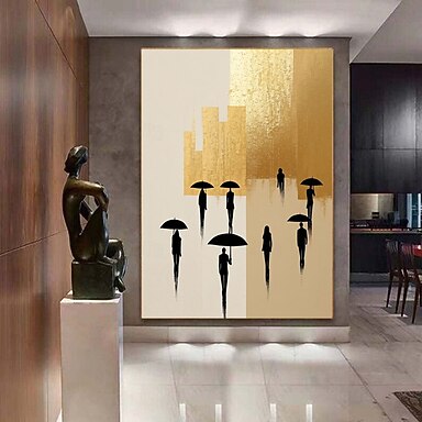nuova arte dipinta a mano in lamina d'oro ad alta qualità, città astratta, dipinto a olio su tela, persone che camminano sotto la pioggia, decorazioni per la casa, quadri da parete, quadro moderno