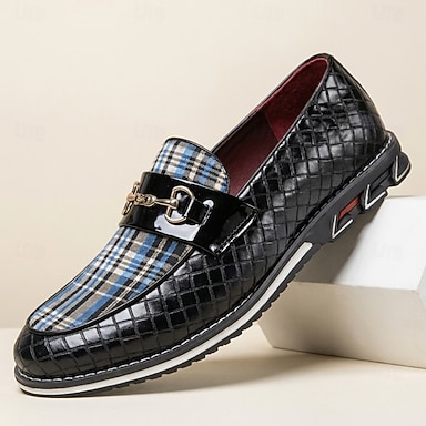 Mocassini da uomo neri a quadri intrecciati con fibbia in metallo, scarpe eleganti slip-on, calzature smart casual da lavoro per matrimoni, ufficio, banchetti, feste e occasioni speciali.