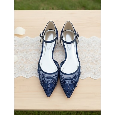 Ballerine da donna blu navy in rete ricamate a punta con cinturino alla caviglia, eleganti scarpe da madre della sposa per matrimoni in giardino, comode ballerine da cerimonia all'aperto.
