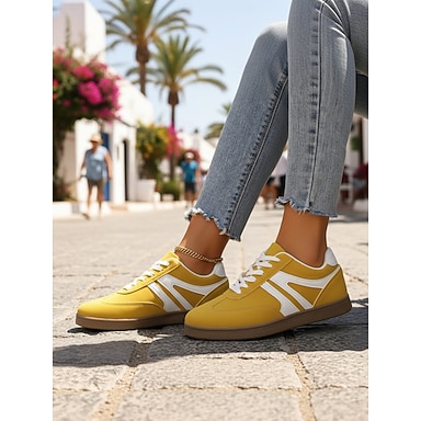 Sneakers basse retrò gialle da donna – scarpe da passeggio leggere con lacci, scarpe casual color block per viaggiare e passeggiare in città &abbigliamento quotidiano