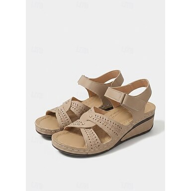 sandali con zeppa beige da donna con cinturino a strappo e design ritagliato, comode scarpe aperte per camminare, viaggiare d'estate e indossare ogni giorno casualmente