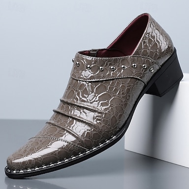 Scarpe eleganti da uomo grigie con fibbia e punta affusolata, con stampa coccodrillo e borchie, ideali per matrimoni, banchetti, feste, balli di fine anno, spettacoli teatrali e serate di lusso.