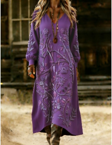 Per donna Abito lungo maxi Abito Boho Abito Vintage Vestito Casual Vintage Quotidiano All'aperto Vacanza Vestibilità regolare Floreale Manica Lunga Scollo a V Viola Primavera Autunno